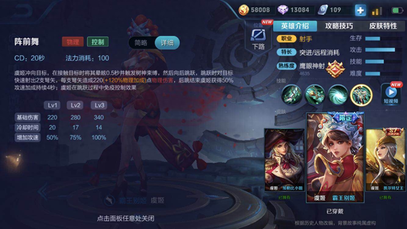 现在虞姬打团的伤害输出都是靠普通攻击了,一技能更多的是用来poke,二技能更多的是用来保命,不要为了追求二技能强化普通攻击的伤害,就在安全的情况下把二技能用了,敌方的物理英雄就等着你用二技能,好轻松地把你击杀掉。
